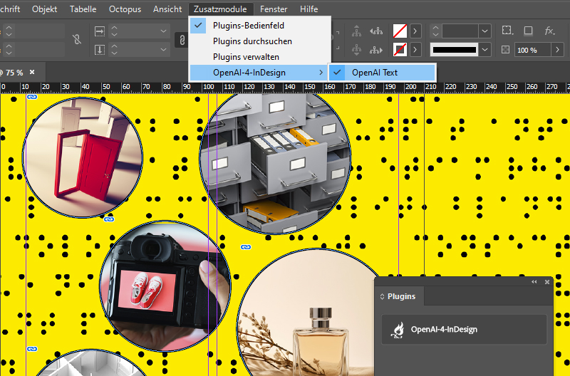 - Anschließend steht das Plugin unter „Zusatzmodule > OpenAI-4-InDesign“ in InDesign zur Verfügung.
