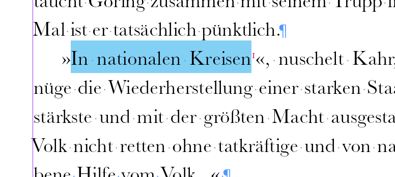 Das „Zitat“, das in den Endnoten erscheinen soll, muss mit einem speziellen Zeichenformat („Endnote“) formatiert sein. Im Screenshot oben in hellblau dargestellt. Danach folgt eine InDesign-eigene Endnote, die den zusätzlich Endnotentext enthält; also z. B. die Quellenangabe. Auch diese Endnote wird mit einem Zeichenformat („Endnotennummer“) belegt; im Screenshot oben als rote römische „1“ zu erkennen.