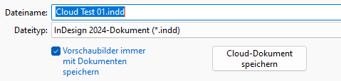 Wenn man nun in InDesign 19.4 eine neue Datei speichern möchte oder bei einer bestehenden Datei „Speichern unter…“ wählt, hat man zusätzlich die Möglichkeit „Cloud-Dokument speichern„. Damit landet das Dokument nicht auf der lokalen Festplatte oder dem Firmen-Server sondern auf einem Cloud-Server von Adobe. WOW! Man erkennt ein Cloud-Dokument übrigends am Wolkensymbol: