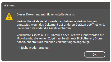 Schriften: Natürlich sind die verwendeten Schriften nicht Teil des Dokumentes. Wenn du ausschließlich „Adobe Fonts“ verwendest, hast du einen Vorteil. Denn diese stehen den Mitbearbeitenden ebenfalls zur Verfügung. Auf Wunsch werden die beim Öffnen direkt mit aktiviert. Hast du eigene Schriften im Dokument verwendet, musst du einen Weg finden, wie alle Mitarbeitenden diese Schriften bekommen können.