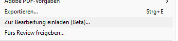 Der große Pluspunkt dieser Funktion ist natürlich, dass man auf diese Weise mit anderen am Dokument arbeiten kann. Es entfällt also das Verschicken per E-Mail, das Arbeiten an gemeinsamen Servern und so weiter. Im InDesign-Menü „Datei“ findet sich die neue Funktion „Zur Bearbeitung einladen (Beta)…“