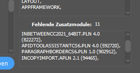 Wenn Du in InDesign mit gedrückter Strg- oder Cmd-Taste auf den Menüpunkt „Über InDesign“ klickst, gelangst du zu (halb)geheimen Information über deine Datei. Unten rechts siehst du eine Liste aller PlugIns, die laut InDesign in diesem Dokument verwendet wurden – in deinem InDesign aber nicht installiert sind. InDesign spricht an dieser Stelle von „Zusatzmodulen“, einem anderen Wort für „PlugIn“. (Willst du noch mehr über das tiefste Innere deiner InDesign Datei erfahren, empfehle ich dir diesen Beitrag über die Dokumentchronik.)